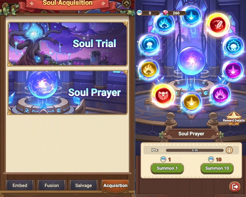 - **Seelengebet:** Mit Seelenkristallen kannst du Seelen beschwören. Dabei hast du die Chance, hochwertige Seelen zu erhalten. Jede Beschwörung bringt dir Segenspunkte ein. Sobald du die maximale Punktzahl erreichst, erhältst du eine violette Seele oder eine noch bessere Qualität. Die Segenspunkte werden dann zurückgesetzt.