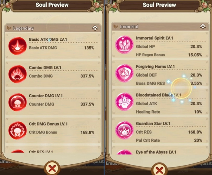 Seelen haben unterschiedliche Qualitäten (Einzigartig, Gut, Selten, Episch oder Legendär) und Attribute (Grundangriffs-Schaden, Combo-Schaden, Konter-Schaden, Kritischer Trefferschaden, Krit-Resistenz, Globaler Angriff, Globale Verteidigung oder Globale HP). Bessere Ausgangsqualitäten bedeuten höhere Basisattribute und stärkere Verbesserungen nach dem Verstärken.